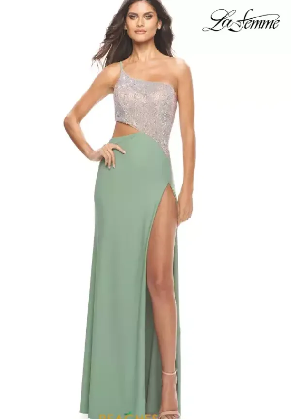 Sparkling and chic La Femme fitted style 31600 displays a stunning bodice of fully adorned beading that beautifully glistens in contrast to the figure flattering jersey skirt. The bodice has a side cut out for extra flair, and features a single shoulder neckline that creates an asymmetrical back style complete with a small corset.