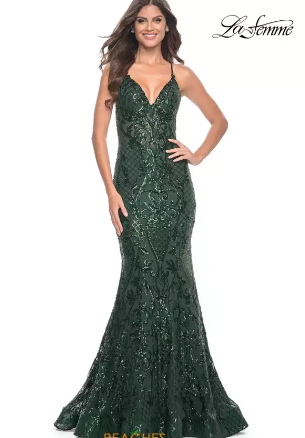 Be the center of attention in this La Femme dress 31943, a ravishing gown perfect for your senior prom. Showcasing a low v neckline, dainty thin straps give this gown a sense of comfort and style. Gleaming sequins adorns the entire ensemble highlighting an elaborate design. The flattering lace up closure accentuates your figure, while the alluring mermaid silhouette highlights your curves.