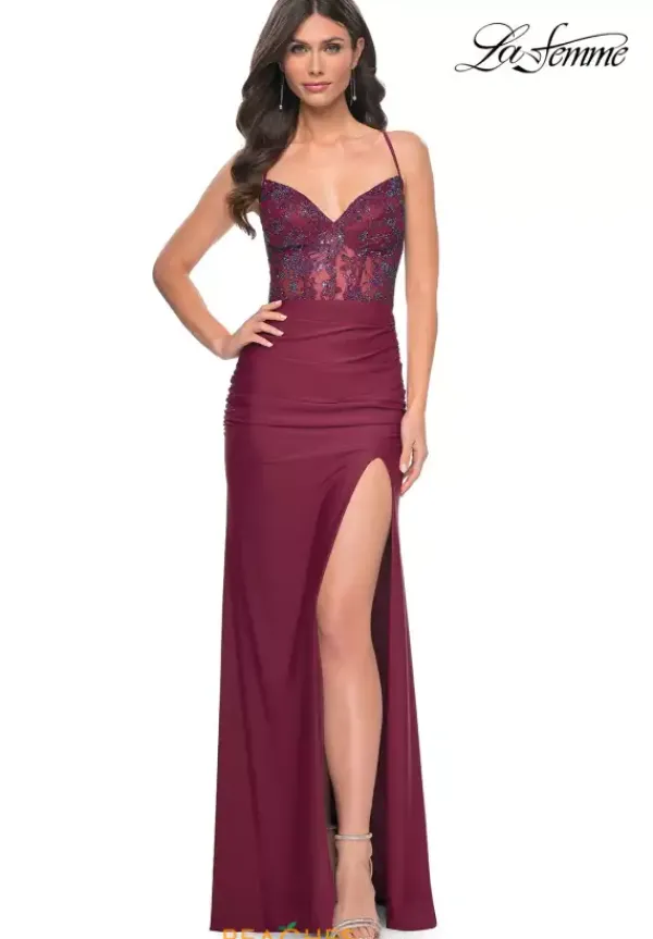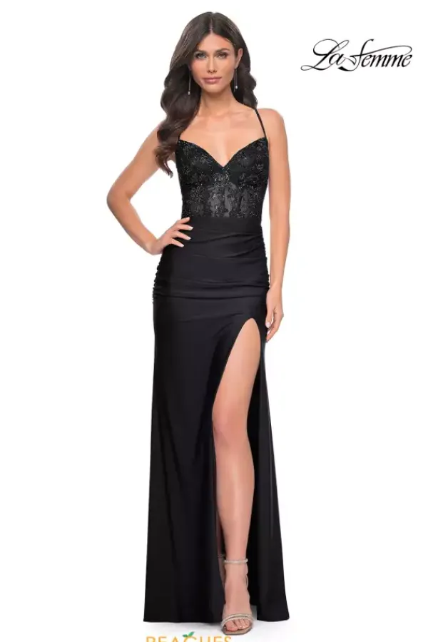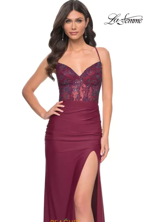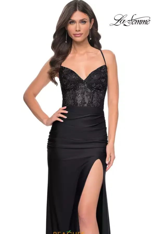 Exude elegance in this ultra chic La Femme style 31988, an ideal choice for your next social occasion. Showcasing a low v neckline, dainty thin straps highlight an intricate lace up closure. The fitted sheer corset is adorn in gleaming beads that give this gown a pop of glitz. Made in sleek jersey fabric, the fitted long dress features an intriguing high slit.