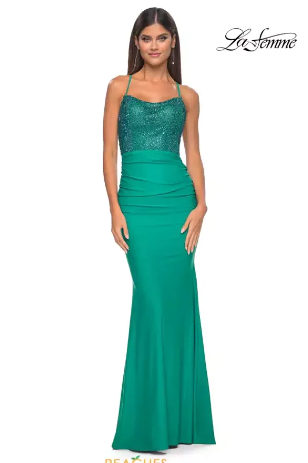Mesmerize in this ultra chic La Femme style 31989, an ideal choice for your senior prom. Showcasing an edgy scoop neckline, dainty thin straps highlight an intricate lace up closure. The fitted sheer corset is adorn in gleaming beads that give this gown a pop of glitz. Made in sleek jersey fabric, the fitted long dress features flattering ruche detailing that accentuates your curves.