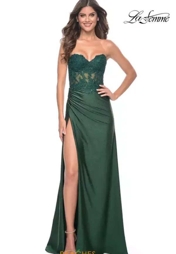 Be the most memorable in this unforgettable La Femme prom dress 32011. Elegant beaded lace adorns the strapless zip up corset bodice for a subtle shine and flattering ruching is featured along the seam of the Thigh high slit for an elegant touch. This gown is created with a classic sleek sweep train.