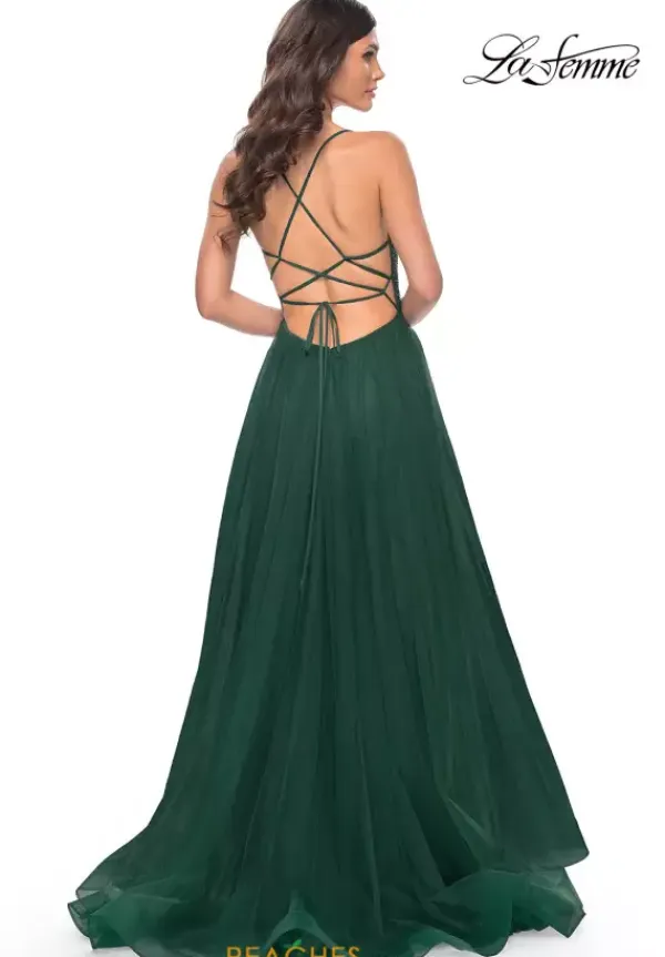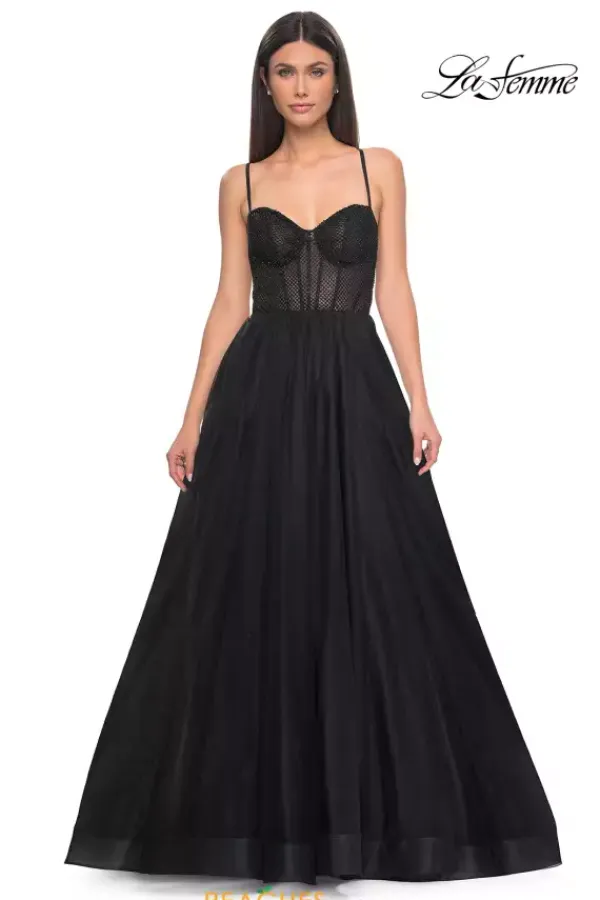 Strut the walkway in La Femme style 32135, featuring a stunning fitted bodice with shimmering beaded net material atop corset boning. Slim, delicate straps lead to an elegant lace up open back style. A prettily flowing, voluminous tulle skirt rains down, creating a lovely A Line silhouette. Finished with a side slit.