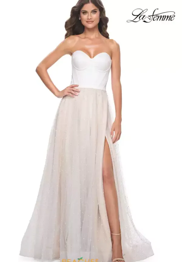 Stand out from everyone and wear the whimsical long style 32149 by La Femme for your upcoming prom. The strapless sweetheart neckline is super flattering and compliments the satin bodice detailed with an illusion back adorned with delicate beadwork. Along the small of the waist starts the flare of the flowing tulle skirt.