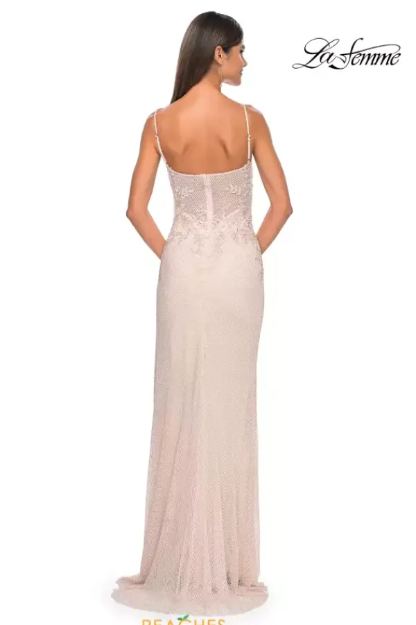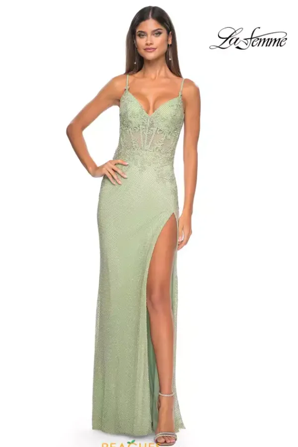 Enhance your natural beauty with this long fitted dress by La Femme, style 32292. Featuring a modern v- neckline with delicate straps leading to a back zipper closure. The top of this ensemble is a see through corset top that will for sure hug your waist beautifully, fully adorned with floral applique. The bottom of this dress is adorned in glistening beadwork. To amp up the drama it has a sexy high thigh slit.