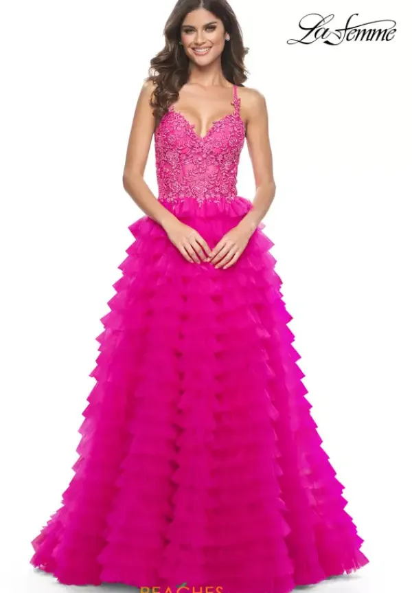 Feel like a fashion icon in this outstanding A line style dress by La Femme, style 32334. This fuchsia/ hot pink dress is made with very elegant lace and tulle and has a beautiful V shaped neckline. This ball gown dress has a perfect slit and corset lace up that makes this dress completely comfortable to enjoy the night in.