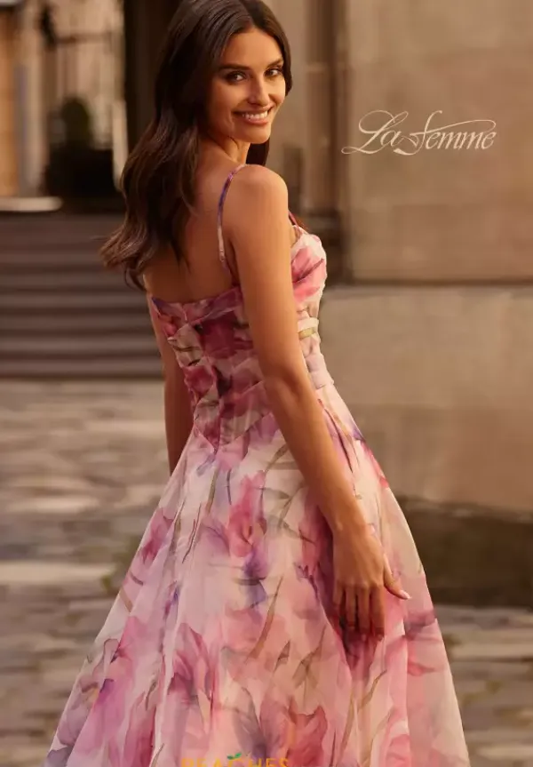Fascinate the crowd when you enter the room wearing this absolutely gorgeous long A line dress by La Femme, style 32686. This dress is made in lovely floral organza that gives you that soft beautiful look. Featuring a scoop neckline with dainty straps and a lovely corset. The skirt and long train flows beautifully together while the slit allows striking poses.
