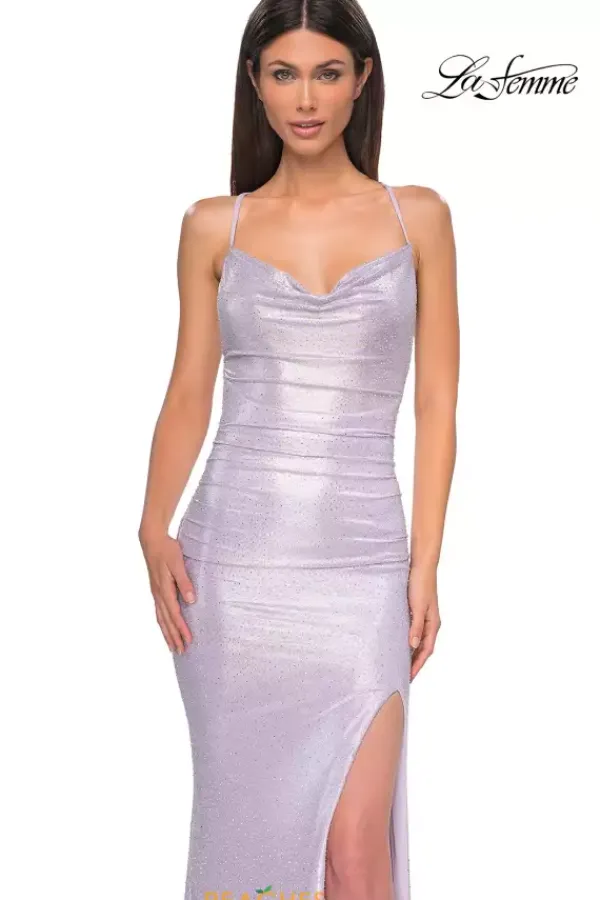 Make a statement when wearing this long fitted dress by La Femme style, 32835. Featuring a modern v- neckline with delicate adjustable intersecting straps leading to a sexy open low back ending with a zipper closure and ruching. Showcasing a jersey lame bottom which will hug your bodice phenomenally. Fully embellished with dazzling beadwork throughout the number. To amp up the drama it has a prefect high thigh slit and a beautiful train.