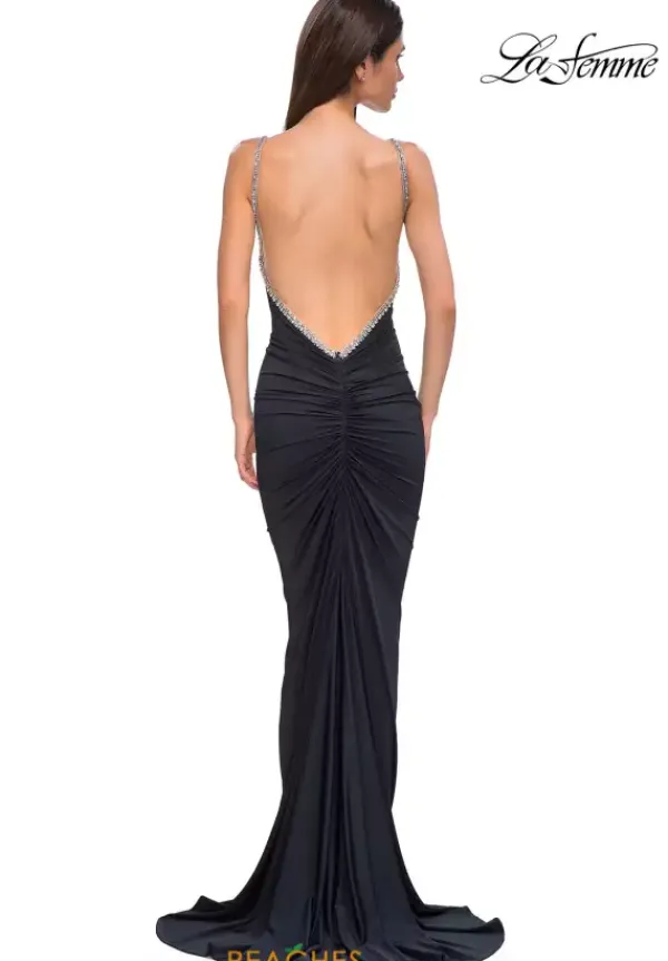 Become a fashionista when you wear this dress by La Femme style 32970. This fitted dress features a scoop neckline supported with beaded straps. The bodice is lined in beading revealing an open sexy back style. The jersey material pairs gorgeously with the sweep train as it flares out gorgeously.
