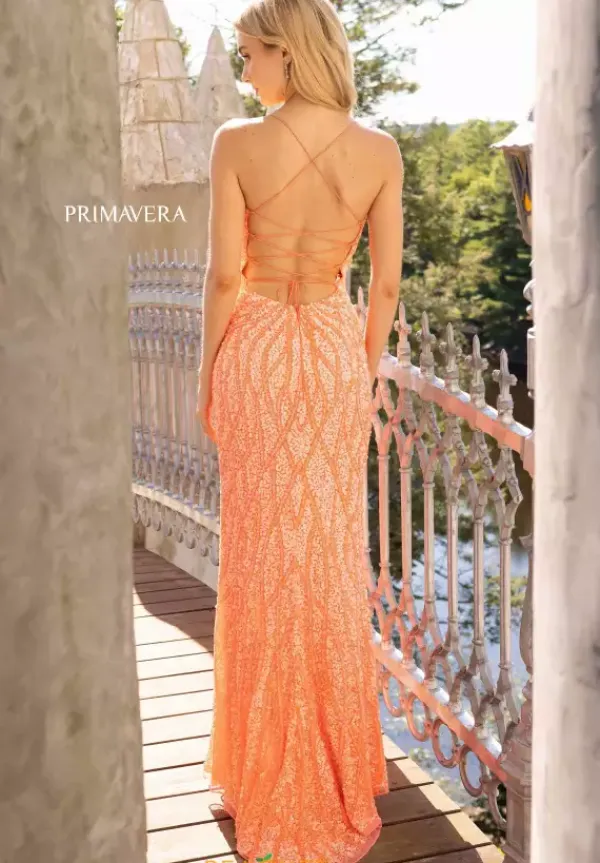 Have a radiant and unique presence at your next event in Primavera style 3959. This fitted gown displays an eye catching beading design that glistens beautifully, standing out from the rest. Featuring a scoop neckline with spaghetti straps that cross in the back and form a flattering corset back style. Finished with a slit and train.