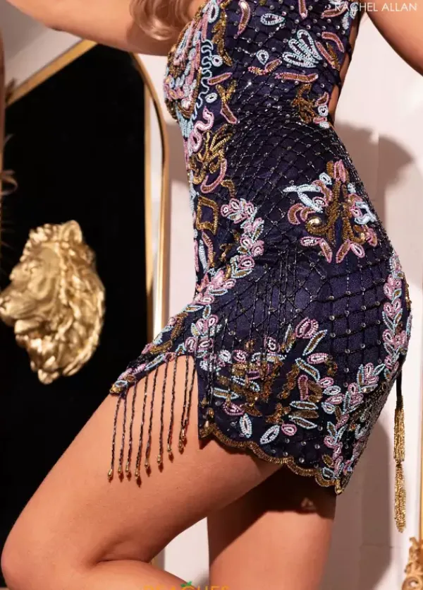 Have all eyes on you when you wear this Rachel Allan dress at your event. Style 40537 features a flattering scoop neckline paired with thin straps that leads to a gorgeous lace up back. This short fitted dress is fully adorned with incredible beadwork that will grab everyone’s attention. The small slit with the fringes gives off a playful and flirty vibe.
