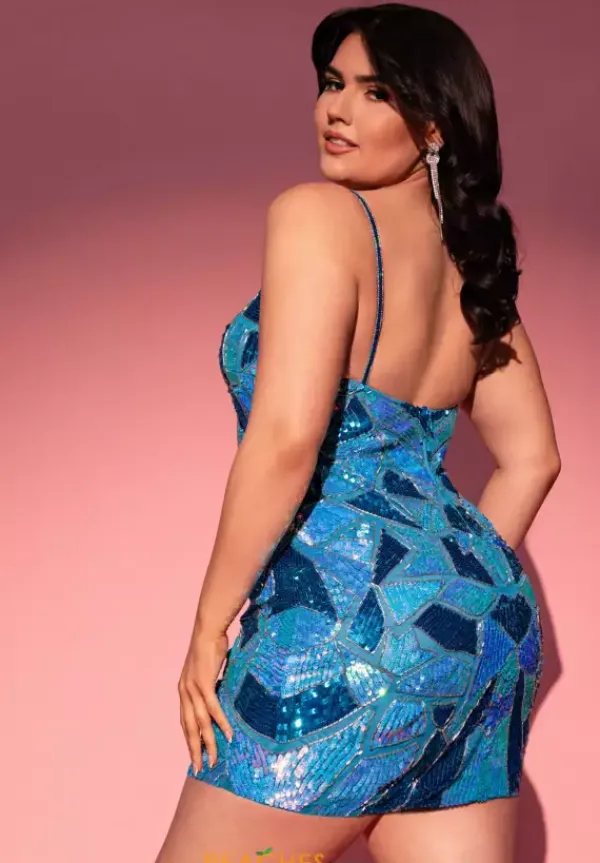 Shimmer and shine all night long in this dazzling Rachel Allan short dress style 40557 embellished in a slimming geometric pattern of glistening beads and sequins throughout. This scintillating style features a fitted bodice with a scoop neckline with illusion insert, spaghetti straps and low zipper closure back. The short, slim skirt hits mid thigh in length.