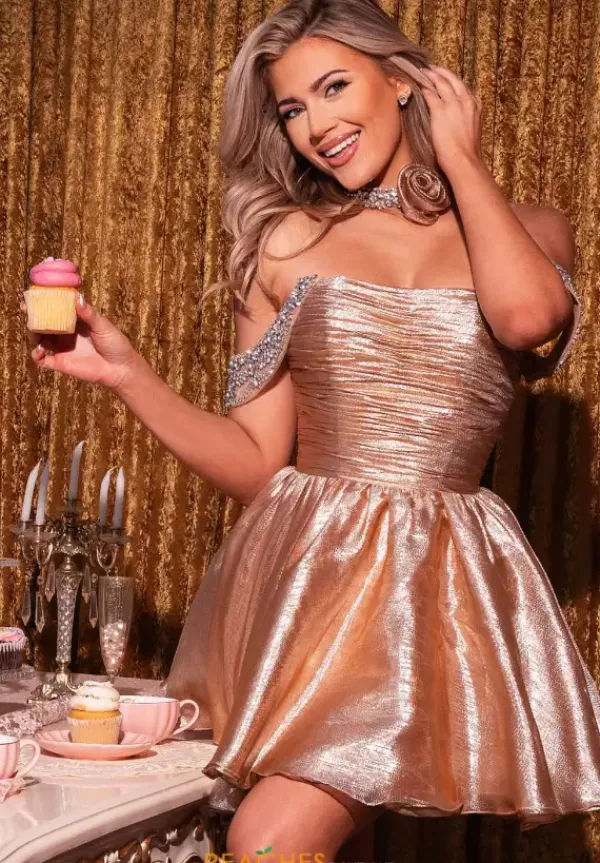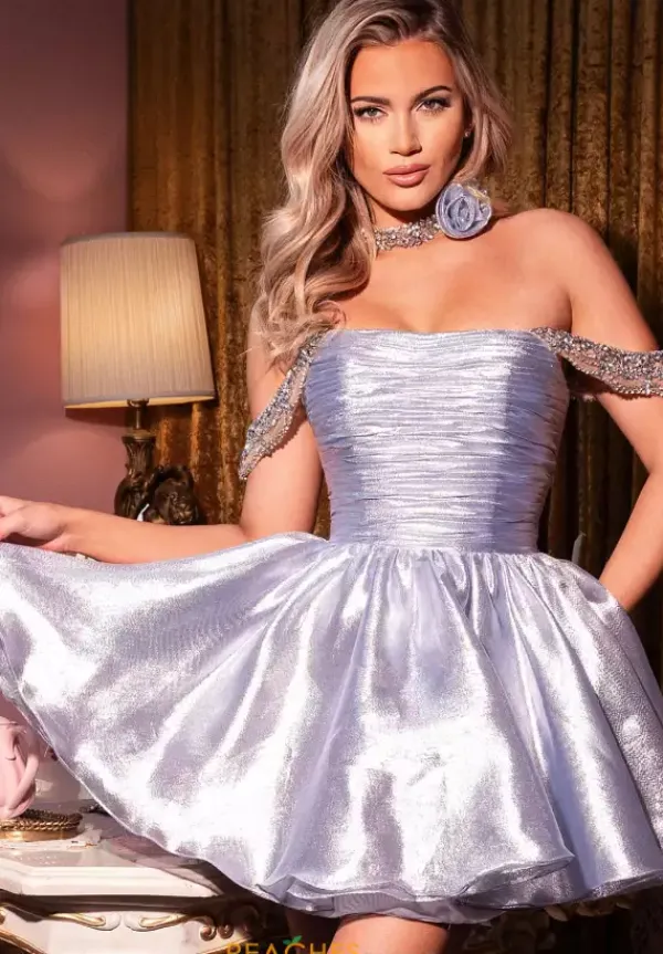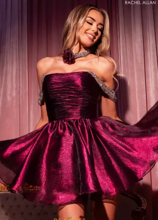 Show stopping style 40636 by Rachel Allan is the perfect choice for your upcoming event. The a line dress features a straight across neckline paired with off the shoulder cap sleeves adorned with glistening beadwork and a matching chocker with a floral detail. Made from an organza material to have you naturally shimmering like a trophy for all your photo.