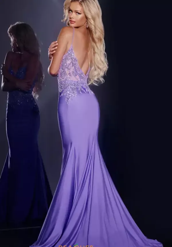 Look and feel incredible in this V shaped neckline dress made by Jovani, style 42221. This dress comes in two magnificent colors, including an astonishing purple and a ravishing red shade as well. This corset of this dress is made with multiple beaded details and applique and rest of the dress is made with soft and classy jersey style material. This dress simply radiates confidence.