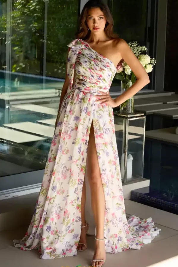 Receive second glaces upon your entrance in memorable long style 42237 by Ava Presley. The asymmetrical neckline decorated with a bow to sit on the shoulder and is paired with a fitted bodice detailed with a side cutout which extends into the subtle open back. Headlining the waist define band which sits just above the cut to the flowing printed chiffon skirt.