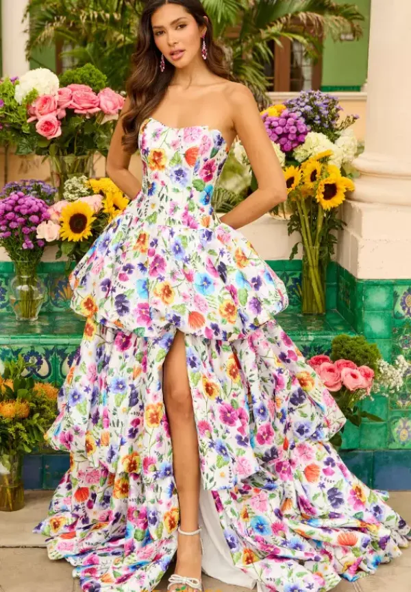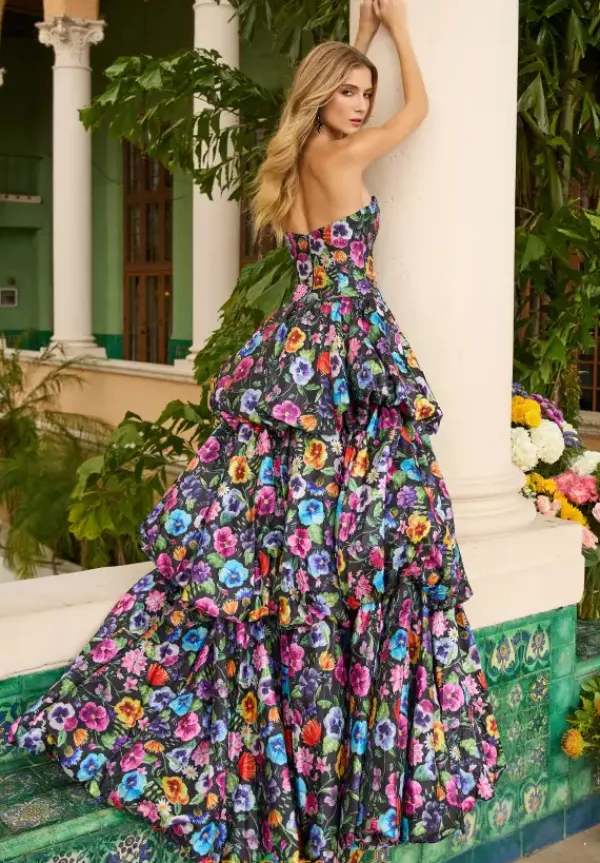 Show up to your prom in this jaw dropping printed Ava Presley a line dress style 42360. This printed satin dress pop with its bold and bright color flowers. The strapless scoop neckline fitted bodice meets a tiered layer skirt with bubble hems on each layer. The dress has a long grand train and front side slit.