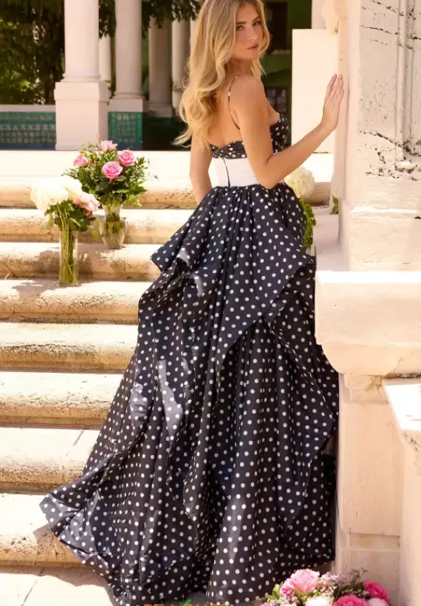 Look and feel like a modern day princess in this stunning gown by Ava Presley style 42362. Featuring a halter v cut neckline and a thick satin belt on the waistline to accentuate your figure. The a line skirt is made in a chic ruffled effect and adorned entirely in polka dots to match the bodice. A fun 3D floral design adorns the bodice for the finishing touches.