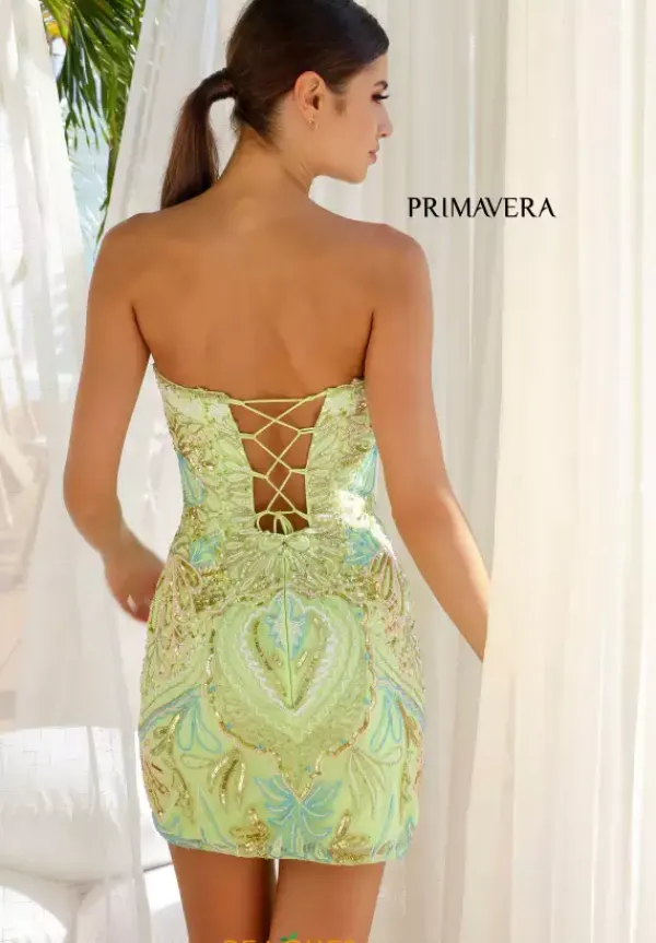 Dazzle the crowd in Primavera short fitted style 4243, a dress embellished top to bottom in a mesmerizing blend of intricate beaded patterns, glamorously complimenting one another. Featuring an elegant strapless sweetheart neckline with a mesh covered plunge. The back style displays a lace up to accentuate the waistline.