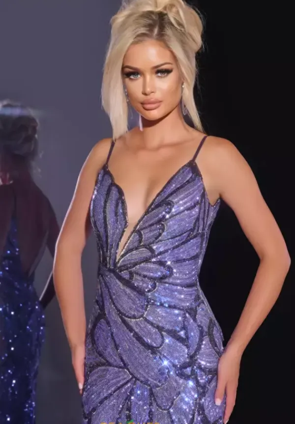 Amp up the drama in this glamorous long fitted dress by Jovani, style 42600. Sexy and striking, this dress features a flattering V neckline and sexy open back. Fully embellished in vibrant beadwork, making you the center of attention. The long train flows beautifully behind you, as you dance the night away.