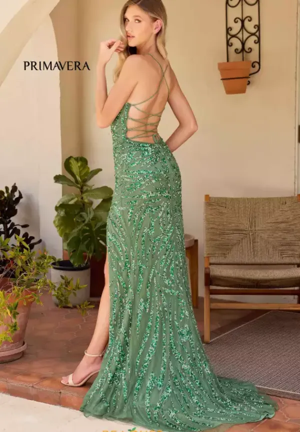 Bedazzle the crowd when you walk in wearing this Primavera long beaded dress style 4303. The scoop neckline dress has a fitted silhouette. The back has a gorgeous lace up corset that starts from the over the shoulder straps. Beading and sequins combined together embellish the dress from top to bottom.