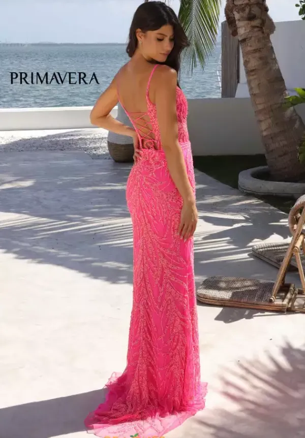 Captivate the crowd when wearing this ravishing long fitted dress by Primavera, style 4310. Featuring a scoop neckline with dainty straps that cascades in a gorgeous corset lace up. Show off your lengthy legs with the slit, while the train flows beautifully behind you. Adorned is lovely beadwork, this dress will for sure make you the talk if the night.