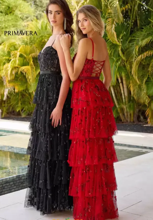 Feel like a modern day princess wearing this graceful long fitted dress by Primavera, style 4341. Featuring a sweetheart neckline and corset lace up that cinches the small of your waist. This skirt showcases lovely ruffles that flow beautifully at your every move. Entirely adorned in beadwork, you will shine the night away.