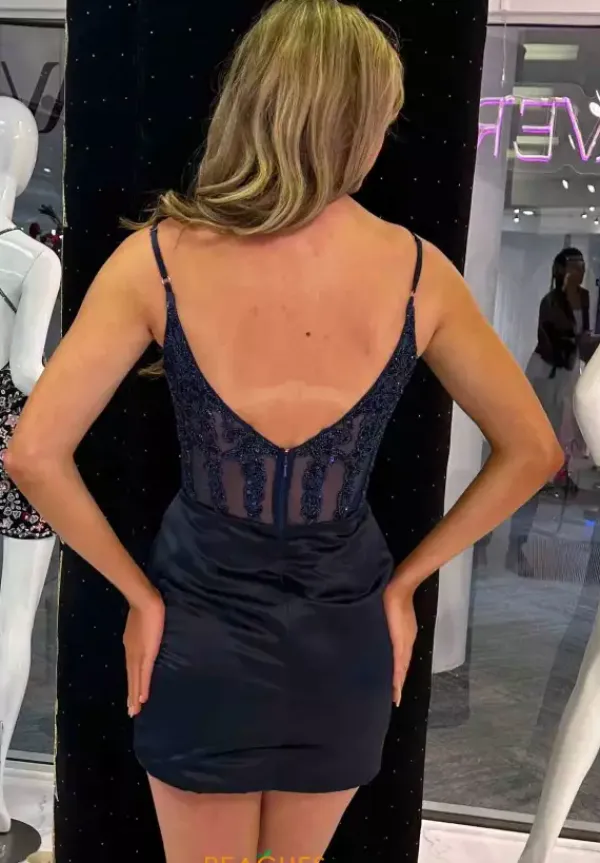 Exclude confidence in this sleek Primavera short dress for homecoming style 4437. The sheer illusion bodice has beaded appliques that adorn the sweetheart bust line. The also continue down the sheer illusion in a vertical pattern. The dress has adjustable thin shoulder straps. The fitted sleek skirt has an asymmetrical hem.