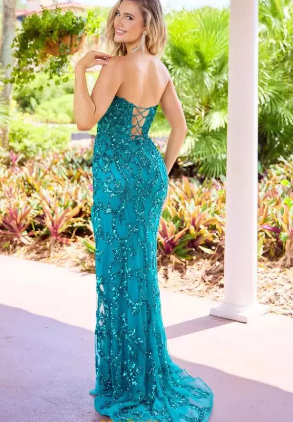 Stand out from the rest of the crowd when you wear this lavishing long fitted dress made by Primavera style 4518. This unique dress features a bold strapless v neckline that cascades to a corset that will hug your waist perfectly. Made entirely in glamorous beadwork and impeccable sequins. The long train flows lovely behind you.