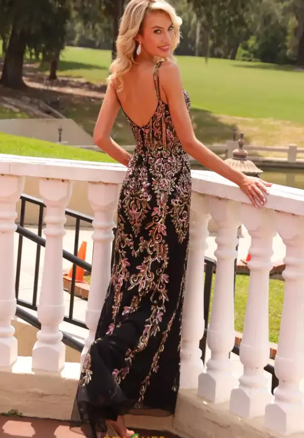 Make a dramatic entrance at your Prom when you show up wearing this jaw dropping long fitted dress by Primavera style 4525. This unique bodice showcases a captivating sweetheart neckline with lovely off the shoulder cap sleeves. The entire dress is made out both exquisite beadwork and stunning sequins. The high thigh slit and long train will leave a great impression.