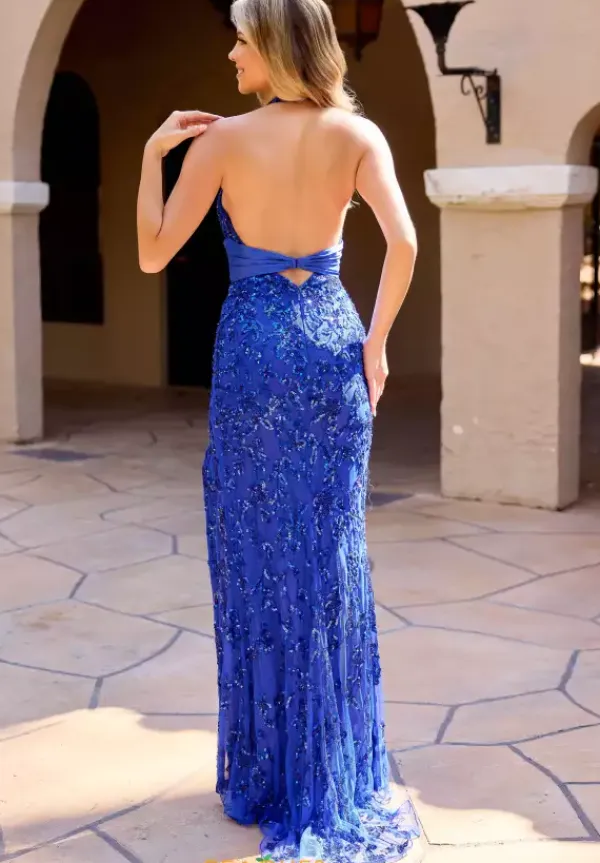 Enticing long style 4538 by Primavera will have heads turning. Featuring the haltered low cut neckline complimented with a lovely belt to tie into a bow to sit just along the waist. Gleaming sequin intricately decorate the entire fitted silhouette and displays a lovely thigh high slit and flowing train.