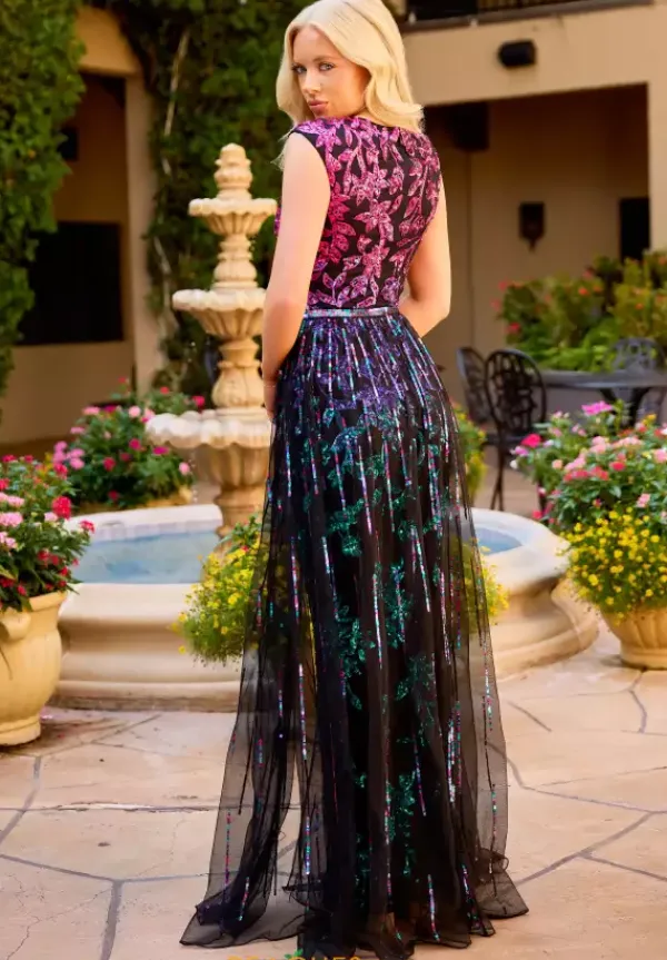 Feel like you just walked onto the run way when you wear this marvelous fitted jump suite by Primavera style 4569. This jumper features a V neckline with cap sleeves and a back zipper. The entire jumper is decorated with stunning beadwork and sequins as well as net material. This jumper also futures a overskirt that will complete the look.