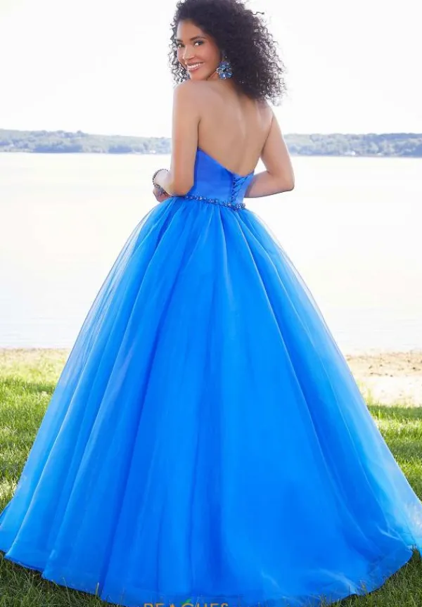 Simply amazing, this Morilee long dress 47040 is absolutely fabulous. The satin bodice has a v cut strapless neckline with a lace up back closure. Flowing gorgeously from the beaded waist, the ball gown silhouette is made with a rich organza material. Make a grand exit when you show off the sweep train.