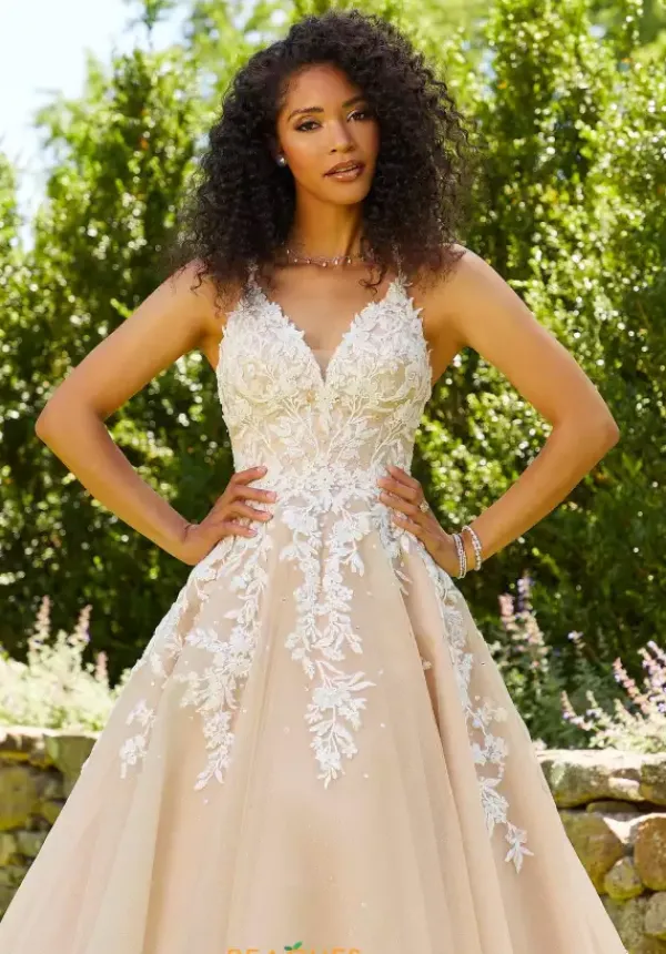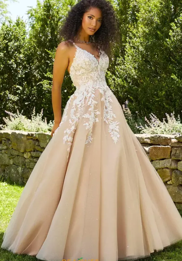 Available in gorgeous colors, this Morilee ball gown dress 47044 is a mesmerizing choice for your special occasion. White lace appliques paired with bead work adorn the fitted bodice and flow gorgeously past the waist. The v cut neckline has thin straps that wrap into a criss cross open back. Be sure to make an alluring exit when you show off the sweep train.