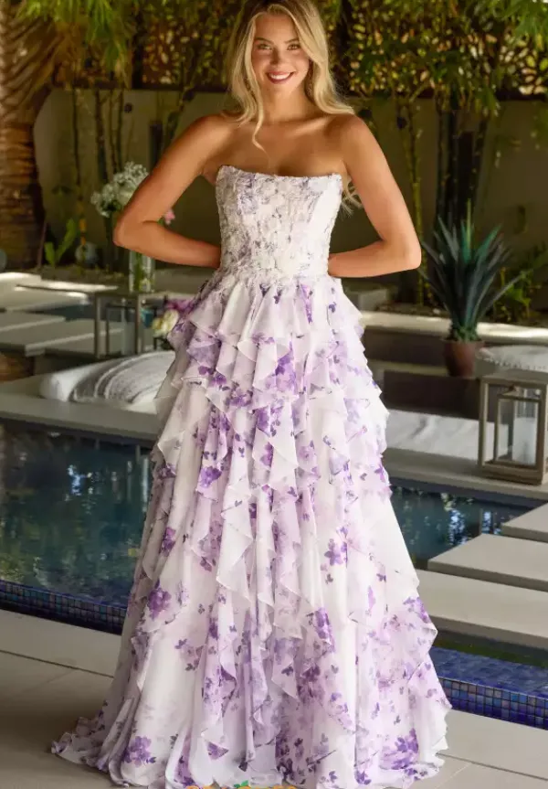 Feel like a modern day princess in this enchanting long dress by Ava Presley, style 47145. Showcasing an a-line silhouette with a strapless scoop neckline that leads to a corset lace up back. The corset bodice is adorned with beautiful beadwork. The ruffled skirt is made out of chiffon material thats sure to flow gorgeously as you move.