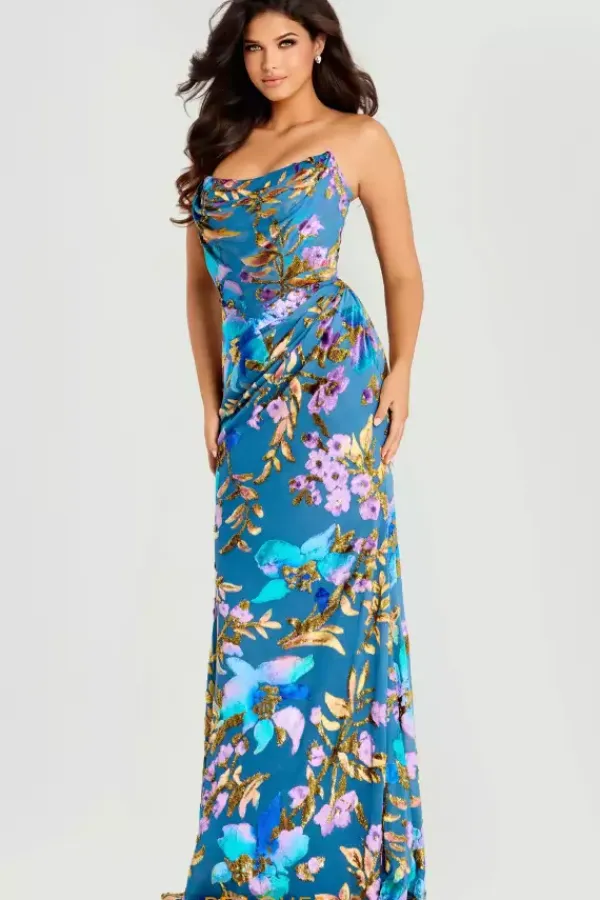 Satisfy the eyes wearing alluring long style 47657 by Jovani. Featuring the fitted corset bodice detailed with a flattering scoop neckline. Along the small of the waist displays body flattering ruching and is fully decked out with unique sequin meticulously placed to mimic delicate floral patterns cascading all down the fit and flare silhouette.