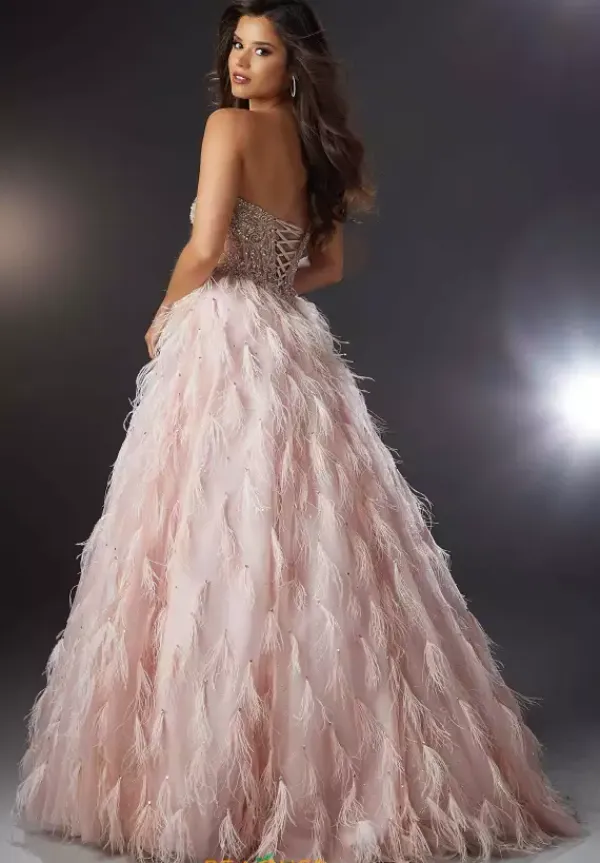 Get a timeless and trendy look in a new Morilee 48001 design that is ready to stun everyone at your next event. A sheer bodice is styled with intricately hand sewn designs and features a sweetheart strapless neckline. The a line skirt begins at the waistline for flattering look as the scattered feathers give the ultimate glam look.