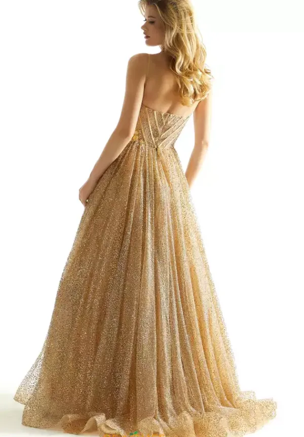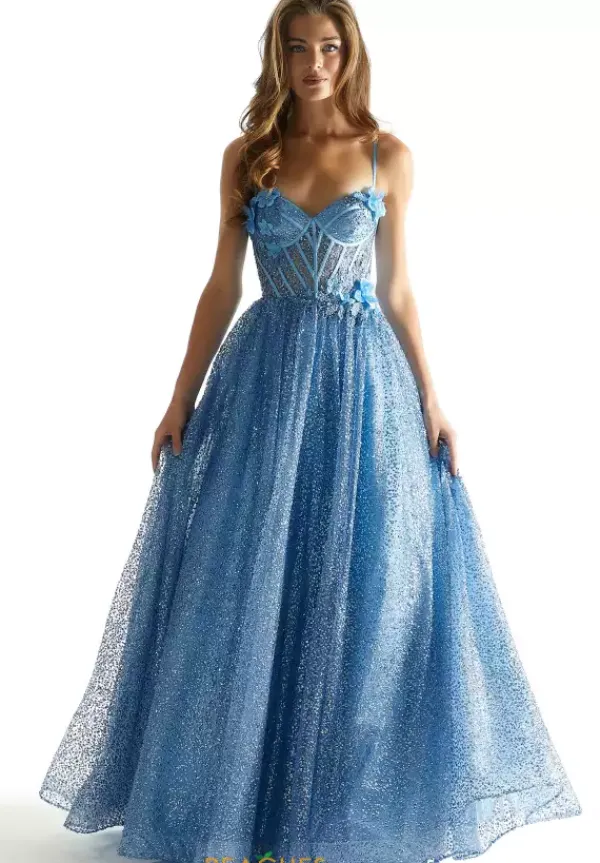 Live a modern day fairy tale at prom when you channel your inner princess and wear this spectacular long a line dress style 49001 from Morilee. This scintillating gown is made in layers of sequin tulle and sparkle tulle embellished with three dimensional flowers and sparking bead work. The sheer corset bodice showcases exposed boning, spaghetti straps and low zip up back. The a line, ball gown skirt flows beautifully to the floor with a sweep train.