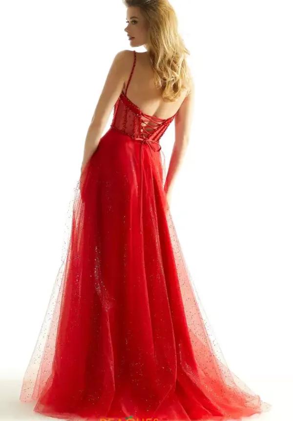 Amp up the drama in this outstanding long dress by Morilee, style 49010. Featuring a glamorous A Line silhouette with a sweetheart neckline that is accompanied by thin delicate straps. The see through corset bodice is fully adorned by dazzling beadwork that is sure to singe you in with the corset lace up back. Complete your look with a high thigh slit glitter tulle skirt.