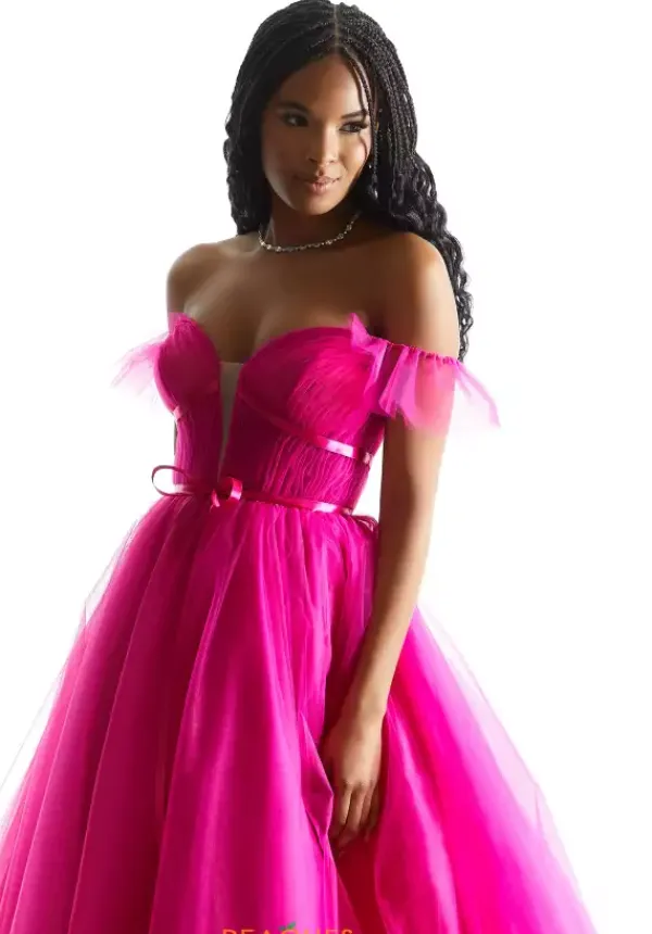 Make a statement this year at your senior prom in this absolutely gorgeous Morilee ball gown style 49022 made in vibrant shades of tulle. This stellar silhouette showcases a pleated corset bodice with a sweetheart neckline, off the shoulder cap sleeves, low back with lace up tie and sweet satin ribbon trim. The long, ball gown skirt has tulle layers, ruffle trim and a sweep train.