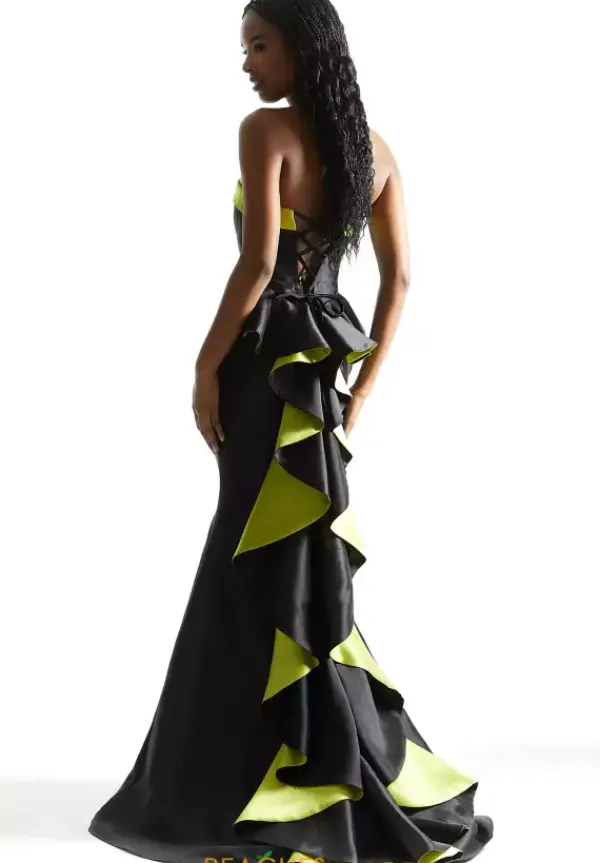 Look like Hollywood royalty at your prom in this sophisticated color block Morileee long dress style 59024. Made in contrasting satin color shades, this strapless gown showcases a corset bodice with a sweetheart neckline and lace up tie back. The fit and flared long skirt has a flounced fishtail back, slit and sweep train.
