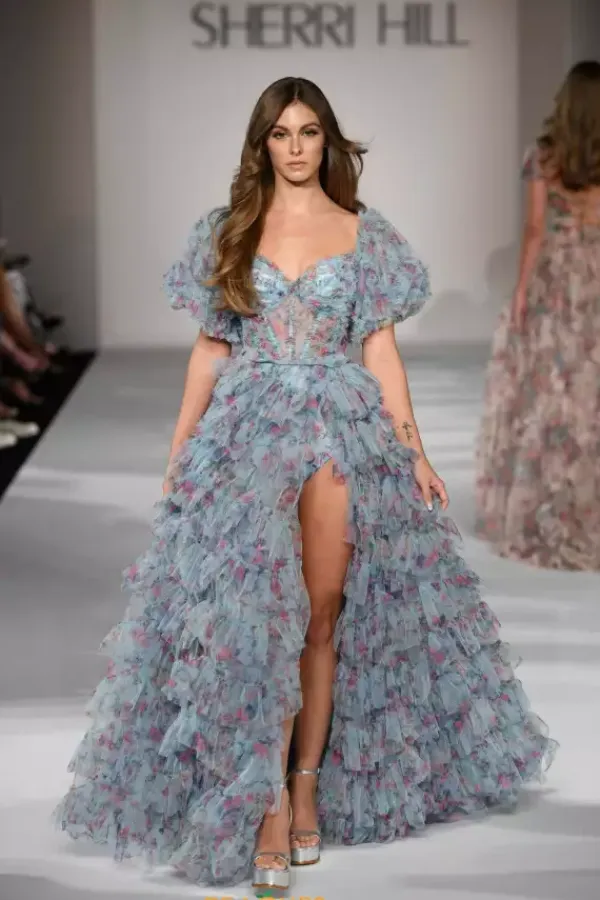 Make a statement in romantic A line dress 55618 by Sherri Hill. This dress is phenomenal with a unique patterned tulle fabric that adorns the entire dress. The fitted corset bodice flaunts a V neckline along with dramatic puff sleeves that add a romantic touch. The flared out skirt has ruffled layers of tulle and displays a thigh high slit.