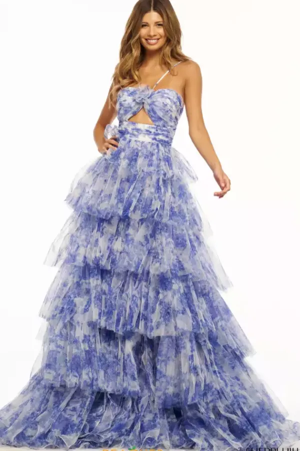 Straight off the runway, this sensational Sherri HIll dress 55980 is bound to turn heads at your senior prom. Eccentric and versatile, this vivacious gown features a chic halter v neckline with a ruched detailing bodice and alluring keyhole cutout. The flattering thick waistline accentuates your curves making this gown a must have. Made in a vivacious floral print, the glamorous multi layer ruffles adorn the a line skirt.
