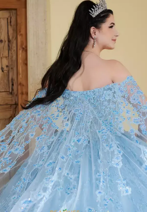 Feel like a modern day princess in this extravagant ball gown by LizLou Quinceanerat style 56510. Featuring delicate thin floral straps that transition into a gorgeous sweetheart neckline lace up back corset bodice. The skirt is made of dazzling glitter tulle with a sweep train that completes this beautiful princess gown.