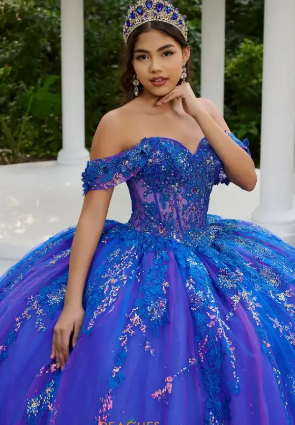 Have all jaws drop as you enter the room wearing this extravagant quinceanera dress by LizLuo, style 56524. This number showcases a sweetheart off the shoulder cap sleeve neckline. The bodice is adorned with gorgeous applique and glistening beadwork thats sure to have sparkling all night long. A beautiful long train is the perfect final touch.