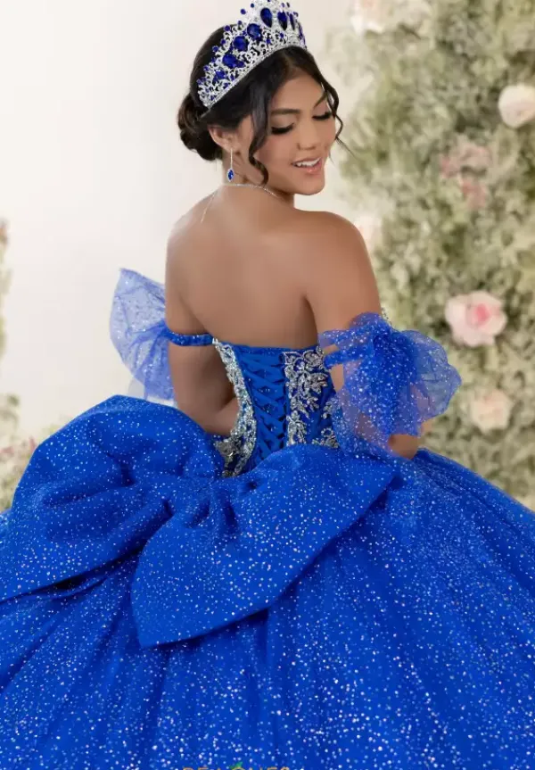 Shimmer from top to bottom when you wear this fully glistening LizLuo Quinceanera ball gown 56561. Bright beads adorn the strapless corset bodice beautifully blending with the glitter of the voluminous glitter tulle skirt, sweep train, and off the shoulder cap sleeves. A matching glitter tulle bow is featured on the back.