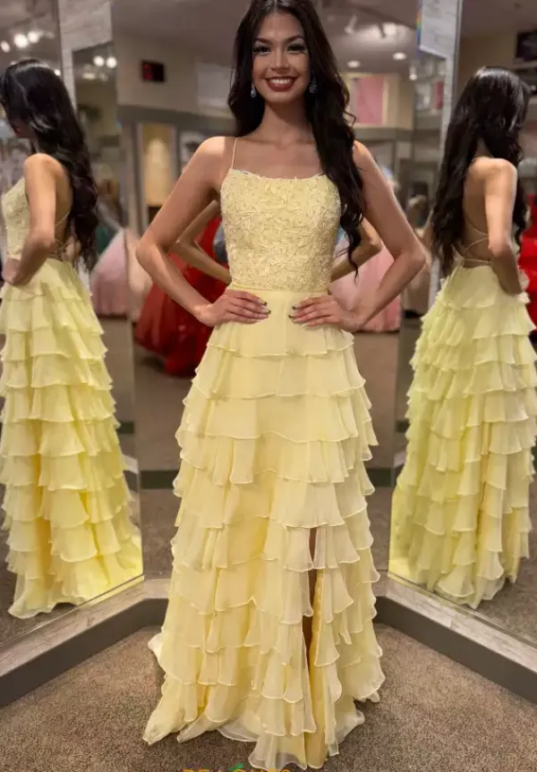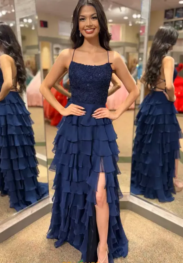 Feel classy when wearing this long a line dress by Sherri Hill, style 56866. Showcasing a scoop neckline with a sexy open corset lace up back that will hug your body beautifully all night long. The top is adorned with floral lace applique and glistening beadwork. The bottom is made out of chiffon ruffle material. For the perfect final touch it has a high thigh slit and a sweep train.