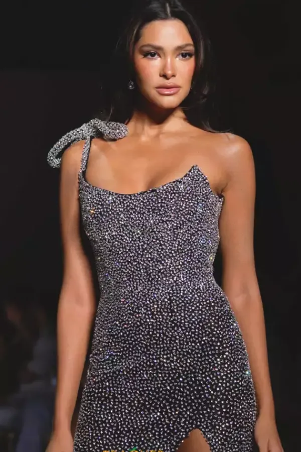 Exude radiance at your next social occasion in this shimmering Sherri Hill long dress style 56887 completely encrusted with sparkling beads. This astonishing gown features a fitted bodice with a scoop neckline, asymmetrical single shoulder beaded strap with bow detailing and low back. The long fitted skirt has an edgy high front, side slit.