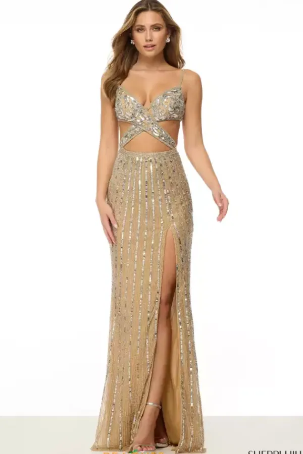 Make heads turn when wearing this long fitted dress by Sherri Hill, style 57185. Showcasing a plunging v- neckline with delicate thin straps leading to a sexy open back with a closure. Featuring a breathtaking intersecting side cut outs that will have all eyes on you. Fully embellished with glistening beadwork patterns and dazzling sequins designs throughout the number. For the perfect final touch it has a classy slit and a sweep train. You will for sure going to look stunning at your next special event.