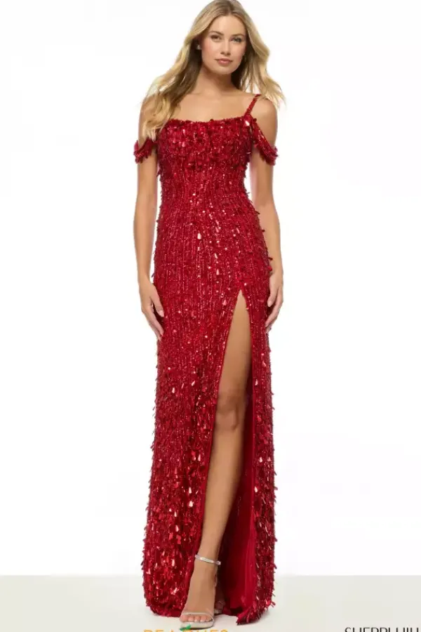 Shimmer and sparkle from all angles when you show up to your prom in this Sherri Hill dress style 57608. This fitted long dress has a scoop neckline with thick shoulder straps as well as off the shoulder cap sleeves. The peyote beading is showcases throughout the dress giving it movement. Completed with a thigh high front side slit.
