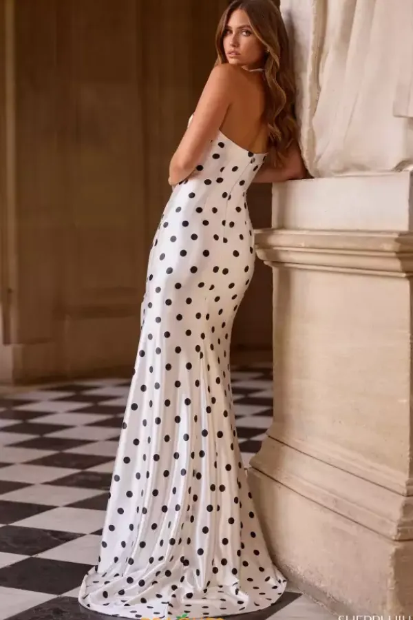 This timeless black and ivory fitted Sherri Hill dress 57802 will be your new favorite dress. Classic Polka dots are featured throughout the entire fitted silhouette for a simple and beautiful effect that pairs hand in hand with the halter V neckline and thigh high slit featured on the soft long skirt.