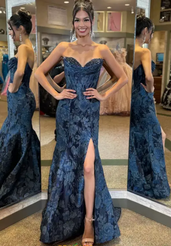 Wear Sherri Hill long dress 57881 for your special event. This fun and flirty fitted silhouette showcases a beaded sweetheart strapless neckline paired with a built in corset bodice emphasizing your waist. The trendy print covers the dress ensuring you look and feel your best all night long and leave you standing out.